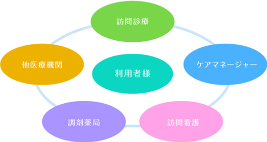 他医療機関や訪問看護、調剤薬局等と連携し、患者様やご家族の方に安心して過ごして頂くサポートをしております。